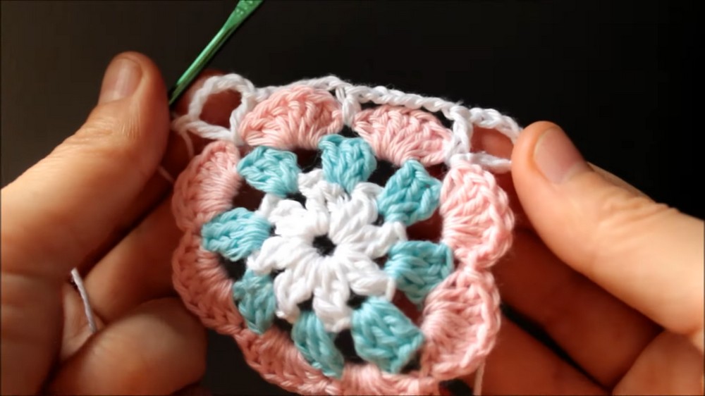 As you continue, additional rounds are added by working three double crochet clusters into larger spaces and chaining to maintain gaps. Always chain two at the corners to give the square a defined edge and allow for smooth expansion.