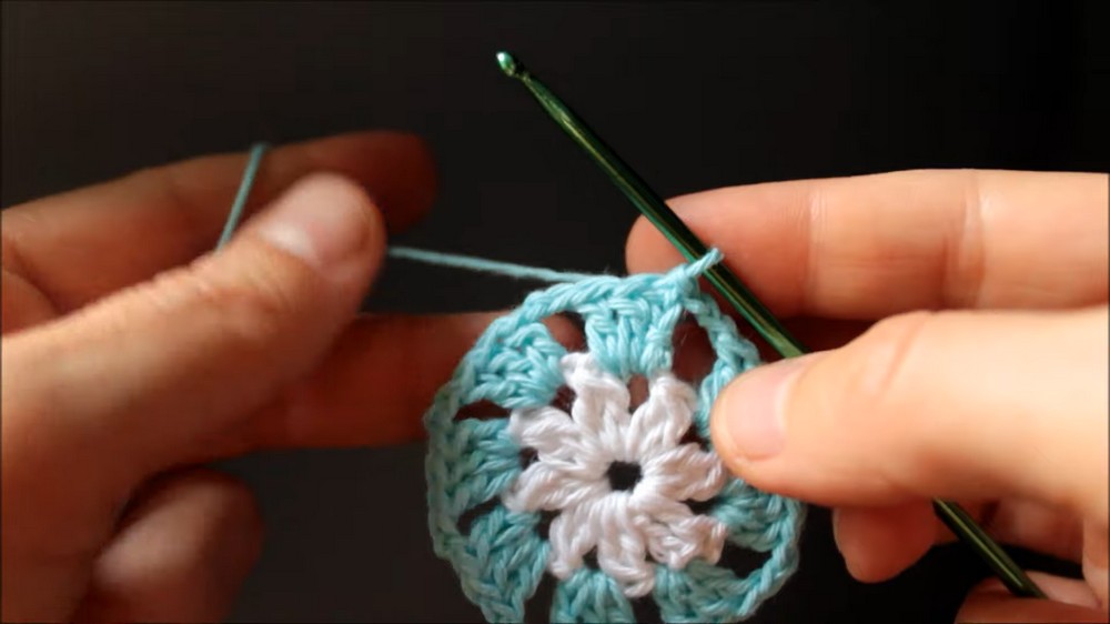 To begin, start with a slip knot and chain four stitches, joining them to form a ring. The first round consists of three double crochet stitches in clusters, separated by chain spaces to define four corners of the square.