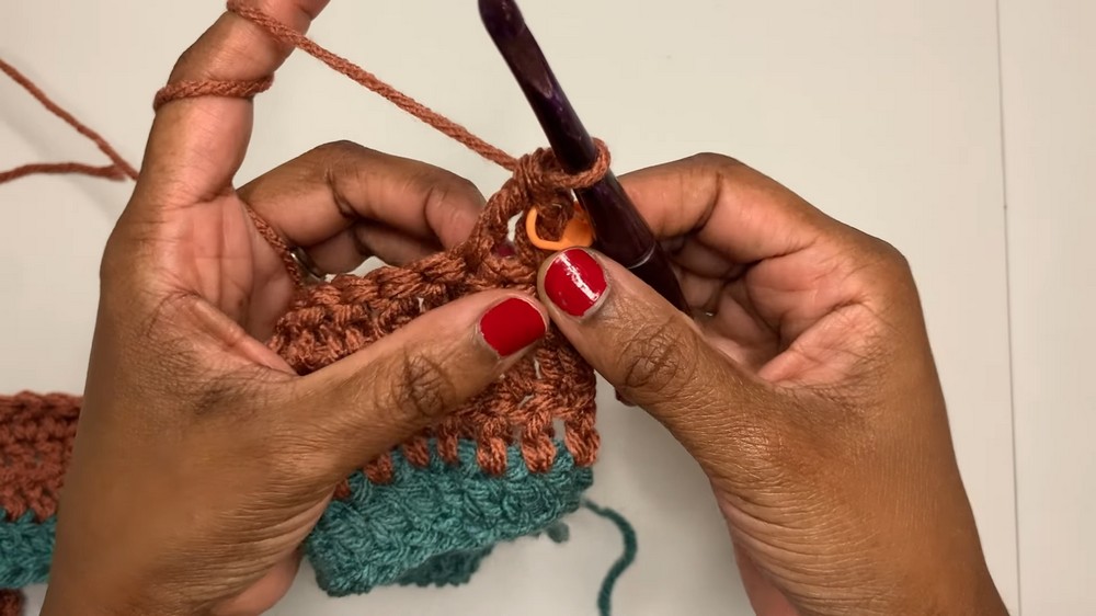 - Switch from Color A (Teal) to Color B (Spice) at the end of the first foundation row.