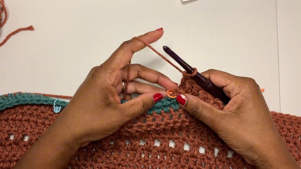- Crochet along the bottom hemline with one row of double crochet in Color A.