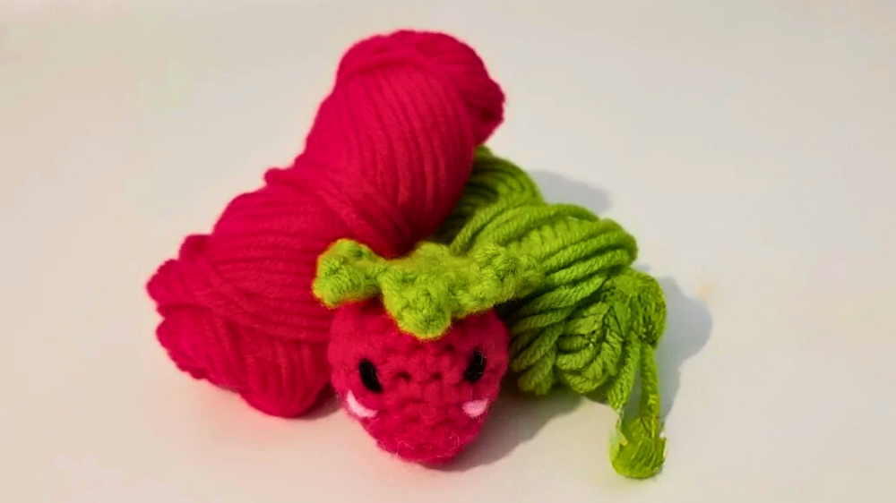 The process begins with a rounded base, shaped through steady increases that mimic the plumpness of ripe fruit. As the rows progress, the body gradually narrows, giving the berry its natural taper. Midway, small details are added through careful stitch placement, suggesting the scattered seeds that make it instantly recognizable. The final touch comes with the leafy green top, worked separately and attached to crown the piece, completing its realistic yet whimsical charm.