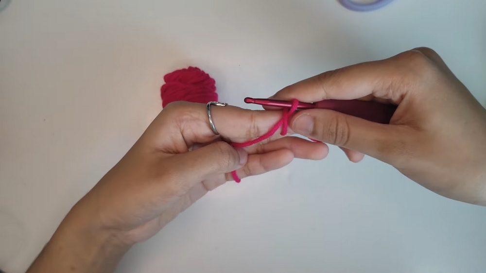 • Loop the red yarn twice around your finger and create a magic circle.