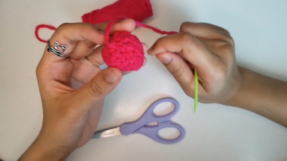 • Pull out the current loop temporarily. Insert stuffing into the strawberry. Avoid overfilling to maintain the shape.