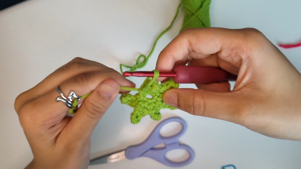 • Repeat the magic circle technique with green yarn. Chain one and work six single crochets into the circle. Pull to close the circle.