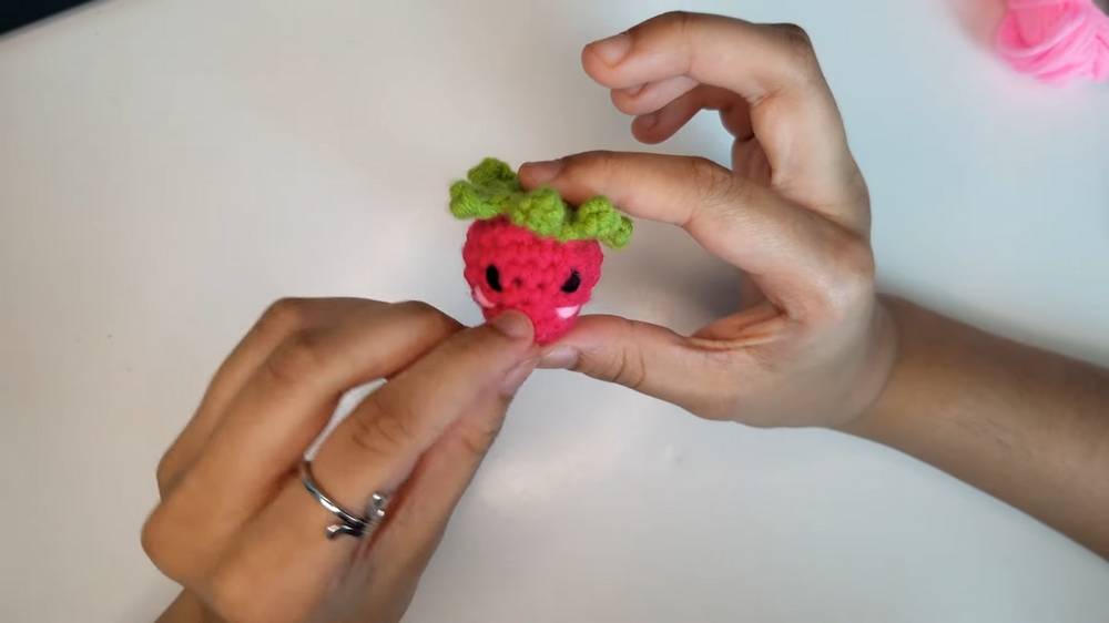 When embroidering the features, use short, clean stitches, and choose a consistent spacing for the eyes and cheeks. This ensures a symmetrical and polished look for your strawberry.