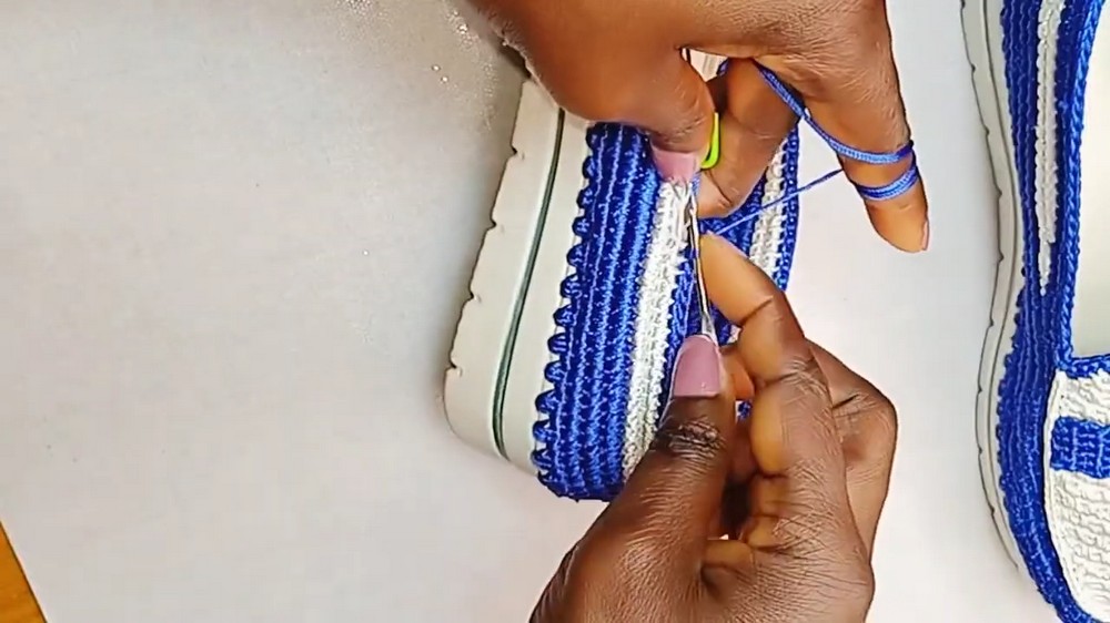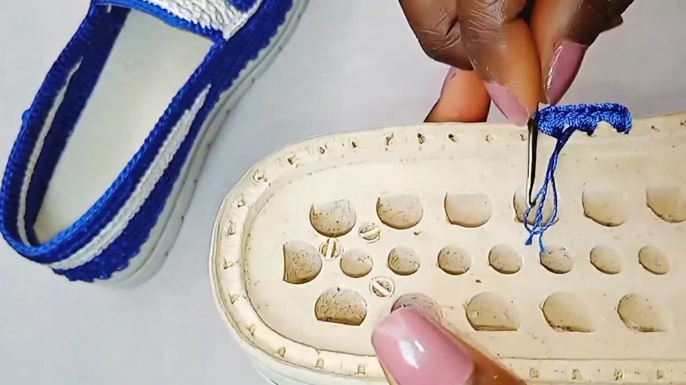 • Start by making three single crochet stitches in each of the prick holes around the sole.