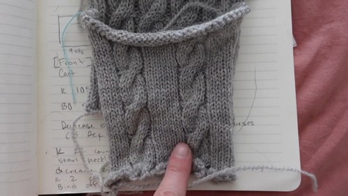 - Several swatches were knitted to determine the exact design, alternating between cables and plain knitting.