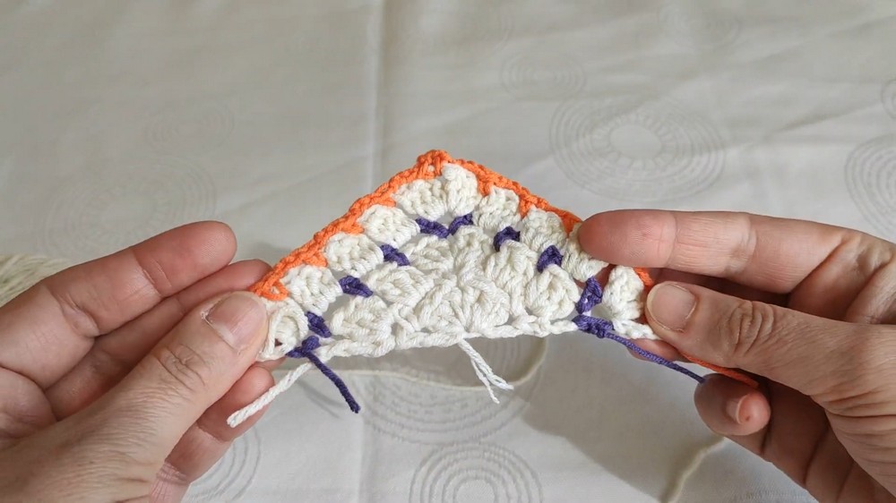 Rows are built by starting with a neutral cream base, while vibrant, contrasting colors such as green, orange, purple, or lilac are added to liven the design. Each row is worked skillfully to ensure a perfect triangular shape, with slight increases at the edges for symmetry and balance.