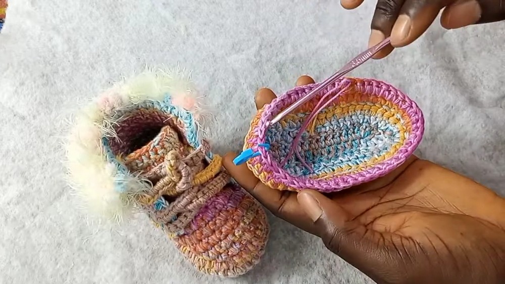 1. Tie a knot and use single crochet stitches to create the base around the top of the sole.