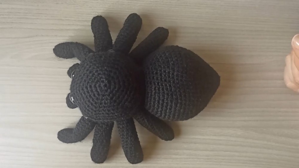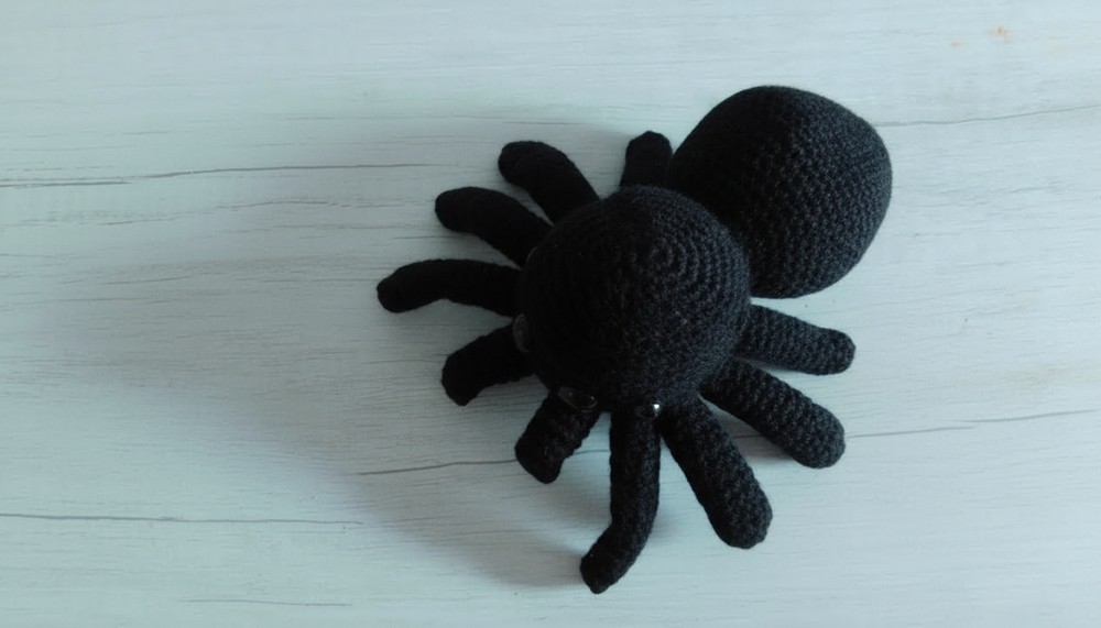 Safety eyes, placed strategically, add a charming touch, and the back legs are crocheted longer to give the spider a raised appearance.