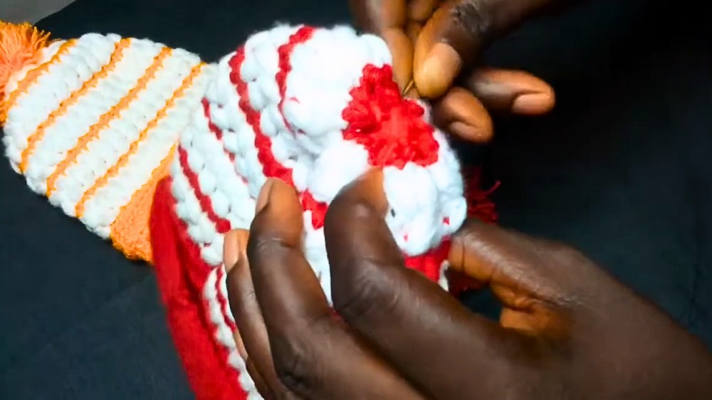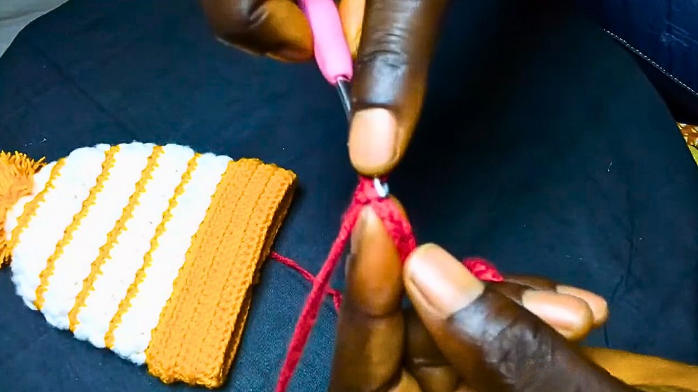 - Once the rows are complete, cut the yarn and secure the ends. Sew the edges of the beanie together using a tapestry needle to close its back seam.