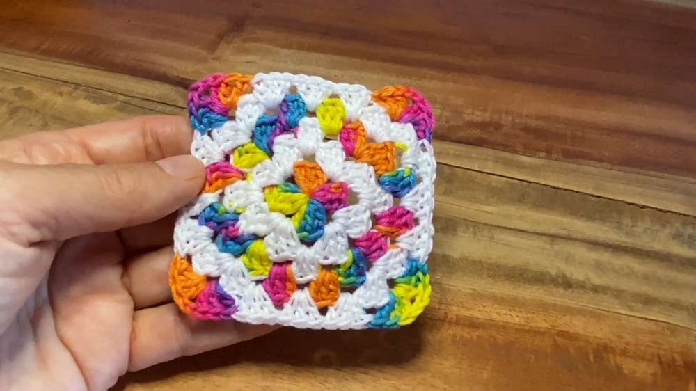 - Expand the Square: To create larger squares, simply continue alternating the rainbow and white yarn in the established pattern.