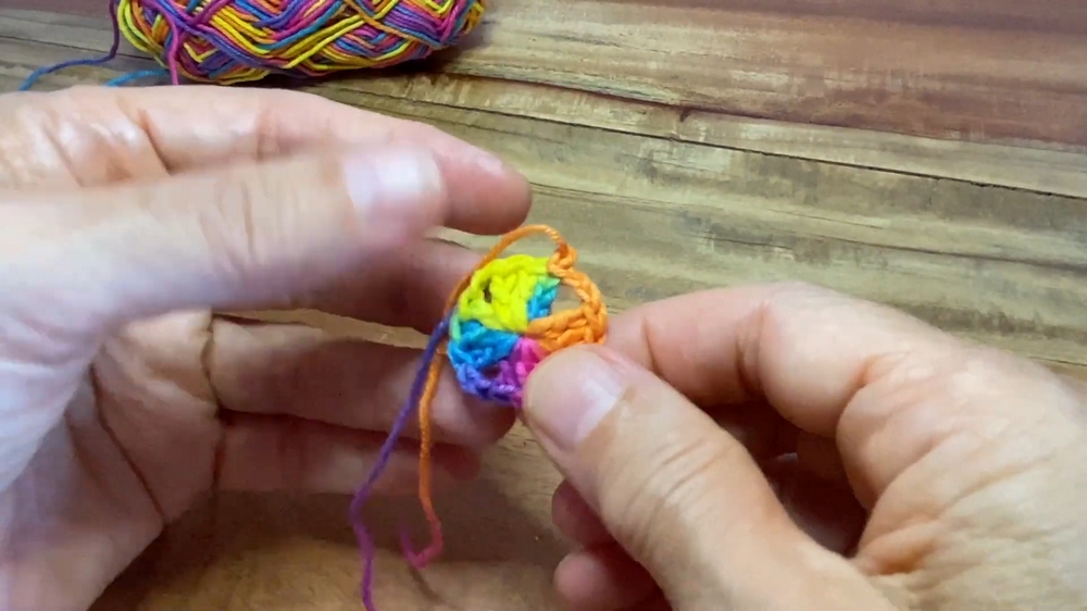 - Slip stitch in the next two stitches to prepare for another round, and reattach the rainbow yarn into a corner.