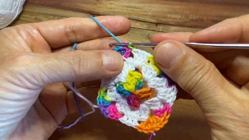 - Complete this round by maintaining the rainbow yarn in the corners and the white yarn between.