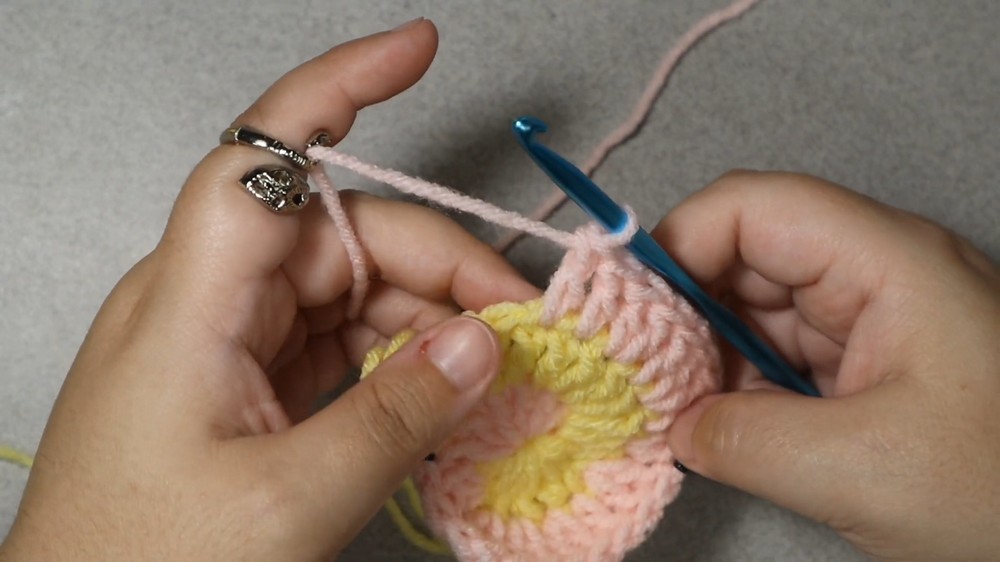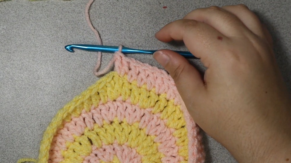 - Pull the new yarn through the last stitch of the first color and begin 6 double crochets with the new color around the circle.