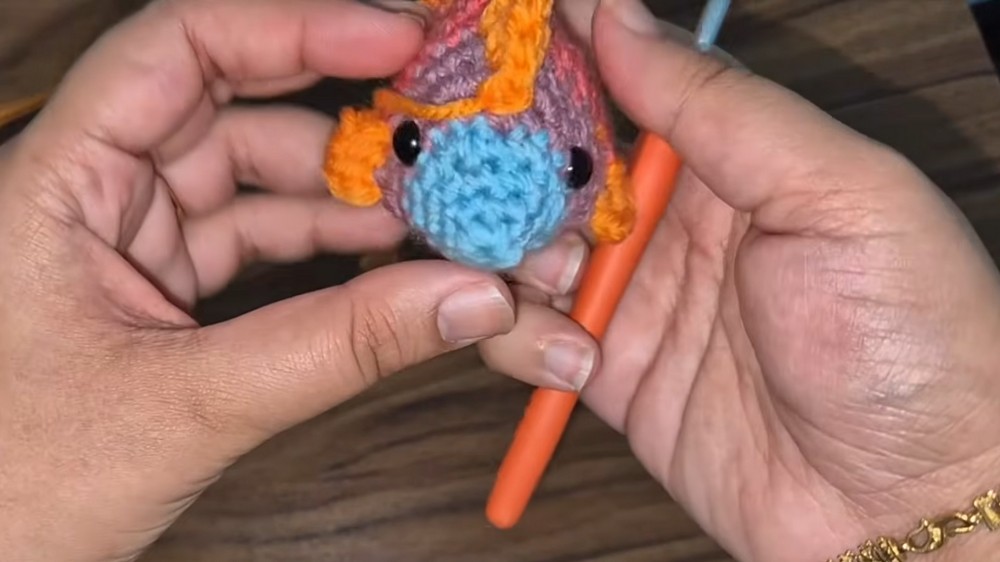 - Fold the last row (6 stitches) in half to form the tail.