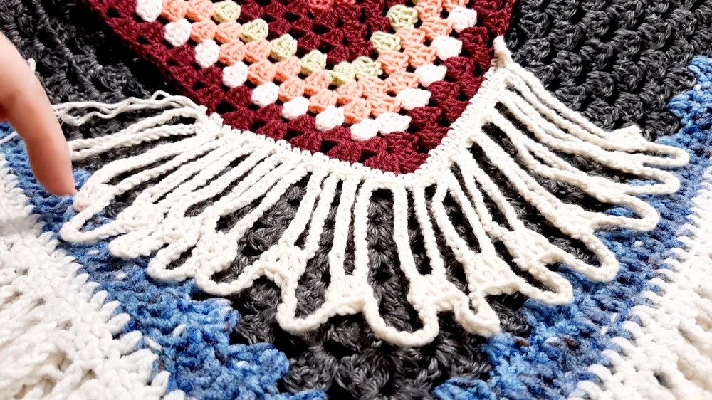 - This row adds decorative dimension to the fringe and stabilizes the chain loops as well.