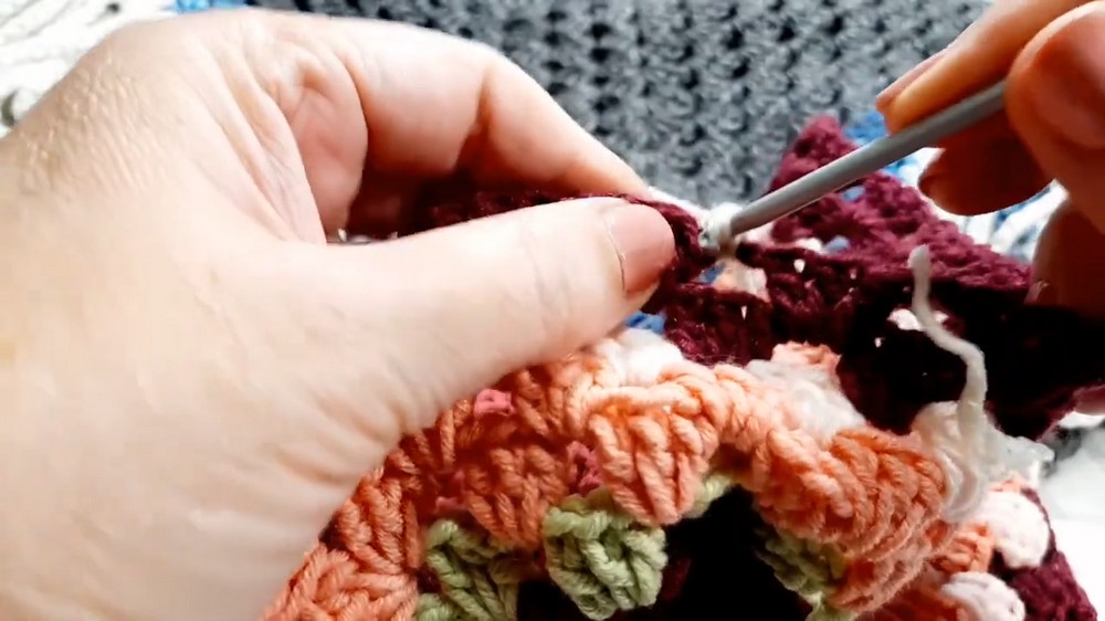 - Continue chaining and double crocheting in the top of consecutive cluster centers across the row.