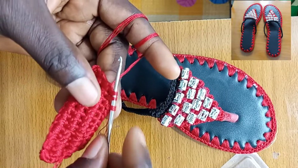 - Combines simple and double crochet stitches to form the slipper's top section.