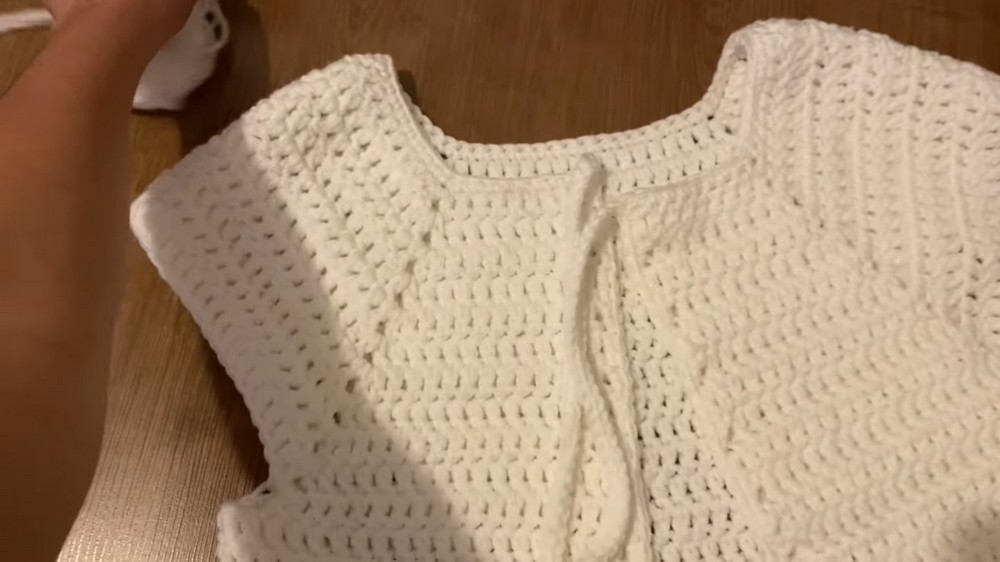 The pattern begins with crocheting the yoke, focusing on shaping the neckline and shoulders through carefully placed increases.