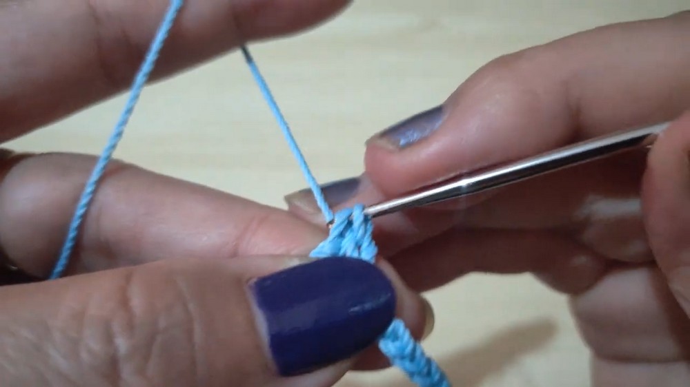 - Starting from the middle point of the base fold, use light blue yarn to chain 2.