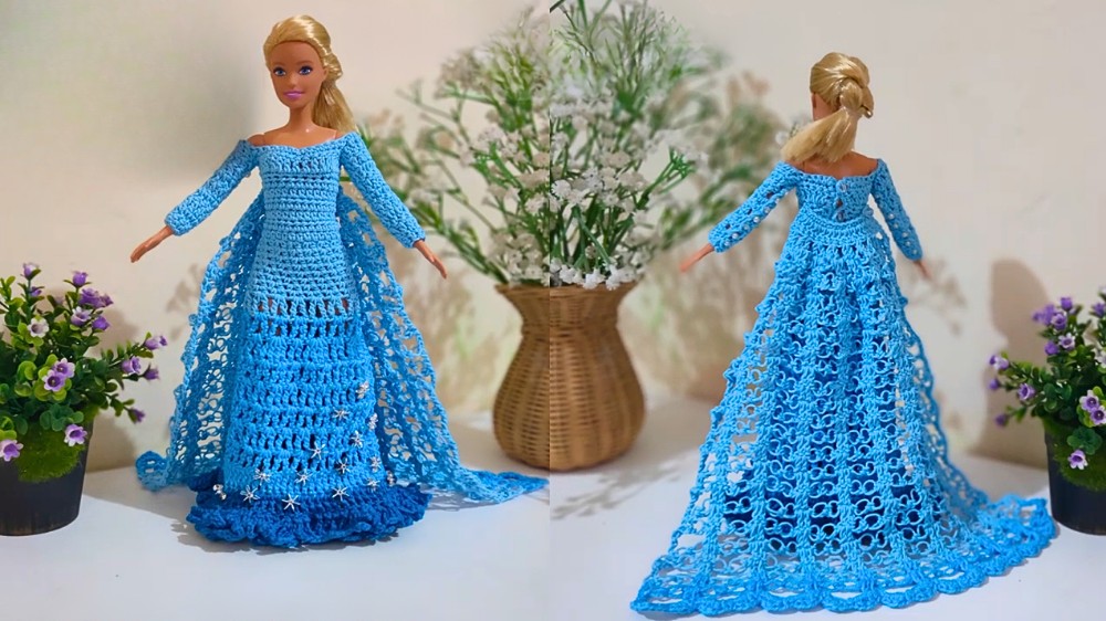This crochet Elsa dress for Barbie is a delightful project for fans of Frozen and doll enthusiasts alike. With its beautifully detailed skirt, tailored bodice, and flowing Solomon knot scarf, it’s both a stylish and magical outfit. Though the project may require some intermediate crochet skills, the pride in finishing this stunning piece will be well worth the effort.