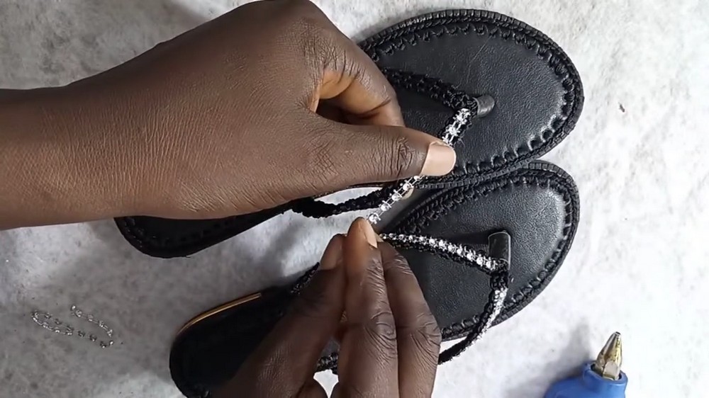 - Use hot glue to neatly place these embellishments on both sides of the straps.