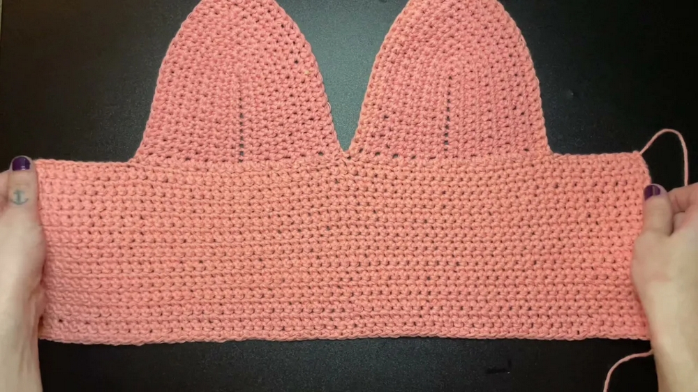 - Chain 1, turn your work, and repeat the process. Increase 3 stitches at the peak (where the stitch marker is) in every row until you reach the necessary number of rows for your size (e.g., 11 rows for a size small).