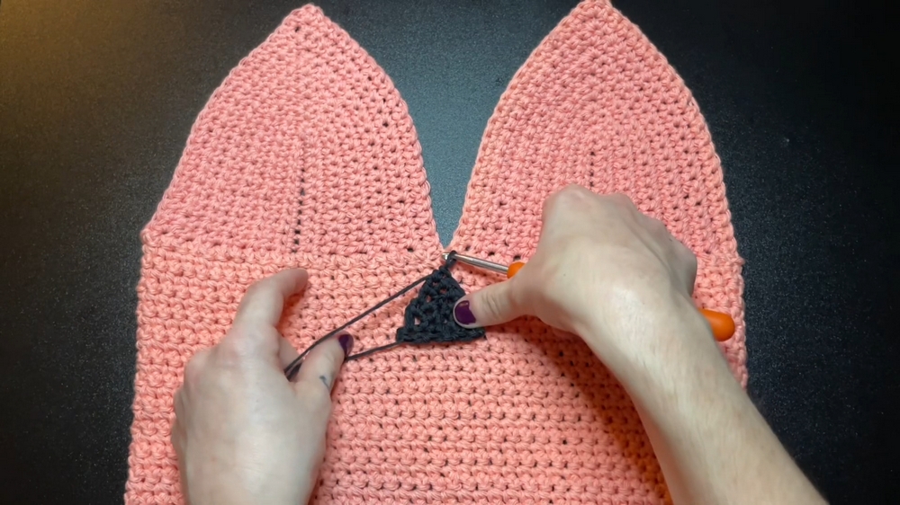 - With black yarn, chain 2 and work single crochets to form a small triangle. Use increase rows (add stitches at the beginning and end) alternated with single rows to grow the triangle until it’s the desired size.