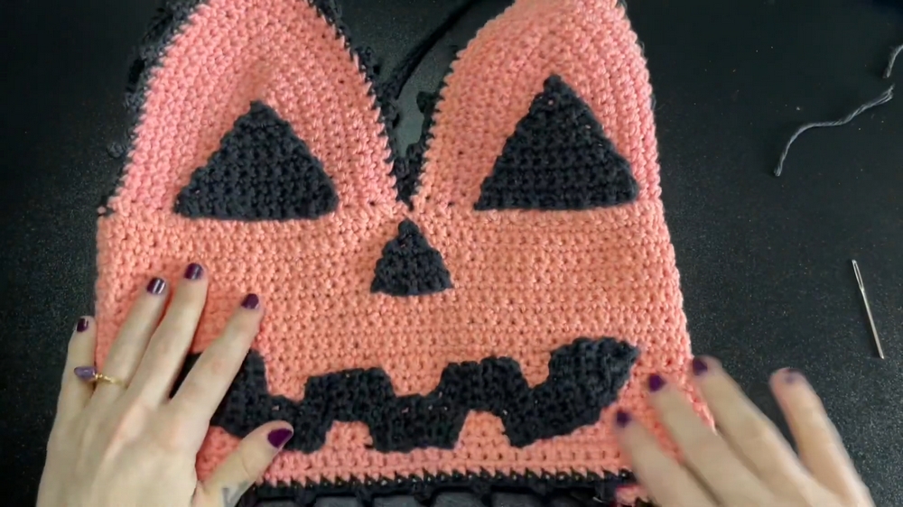 Take your time placing the jack-o’-lantern face pieces! Use stitch markers or pins to hold them in place before sewing to ensure symmetry and alignment, reducing the chance of uneven placement.