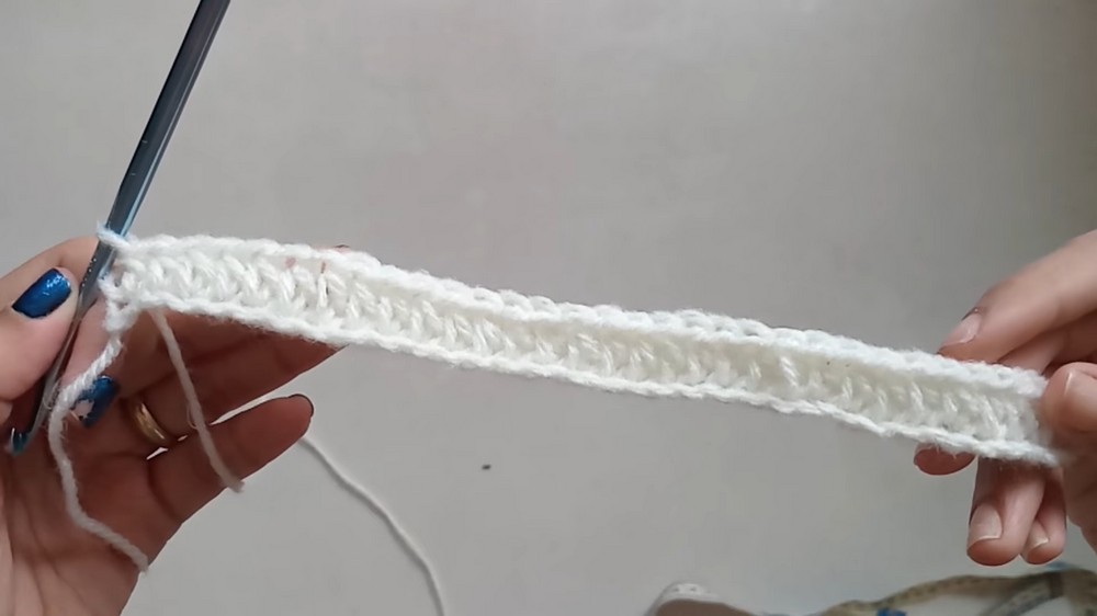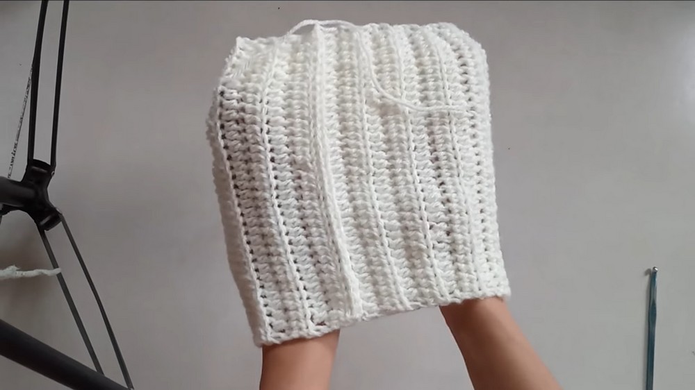 Once the base rectangle is complete, the fabric is folded and seamed along the edge using slip stitches, creating the main body of the hat.