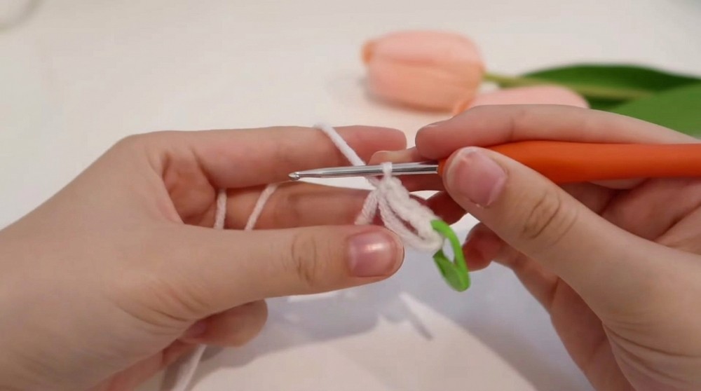 - Yarn over to secure the loop and begin crocheting.