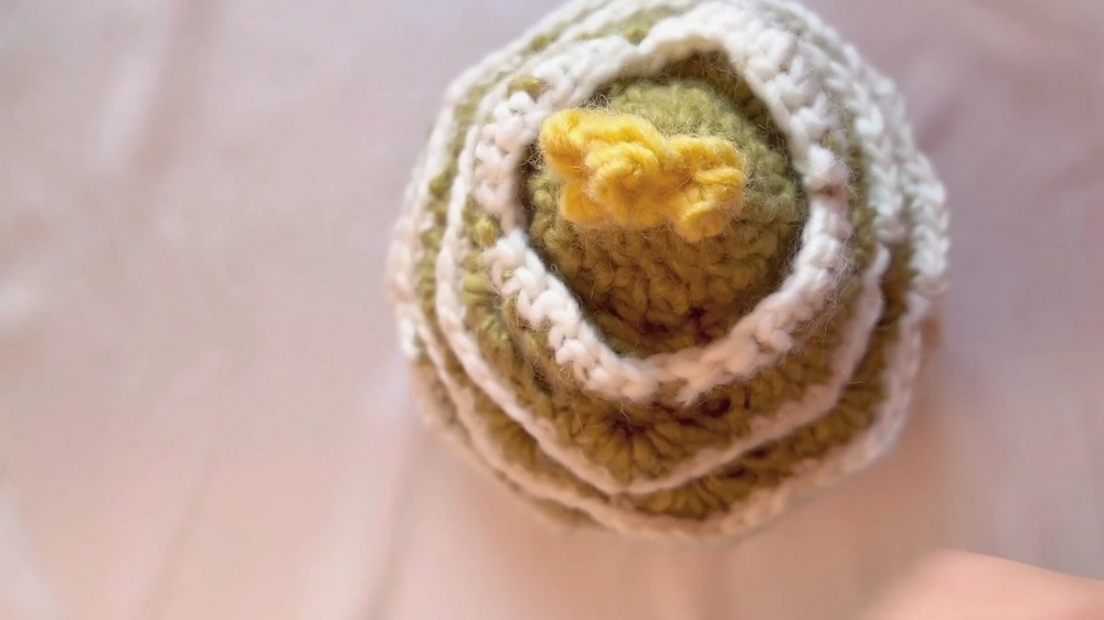 The trunk is worked in brown yarn, incorporating double crochet stitches with strategic decreases to create a sturdy base that allows the tree to stand independently.