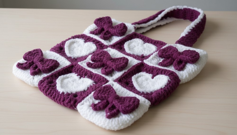 Adding embellishments like bows uses varied stitches—including single crochets, half-double crochets, and slip stitches—creating a decorative character to your tote.