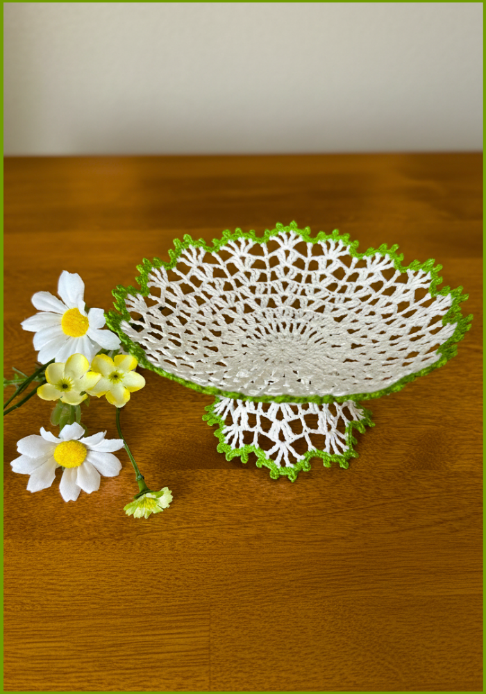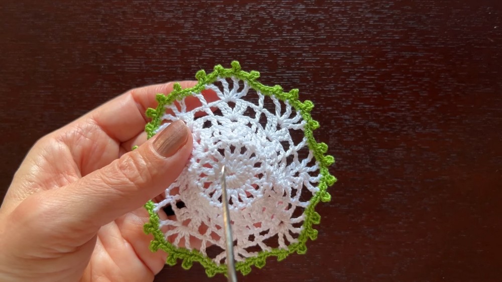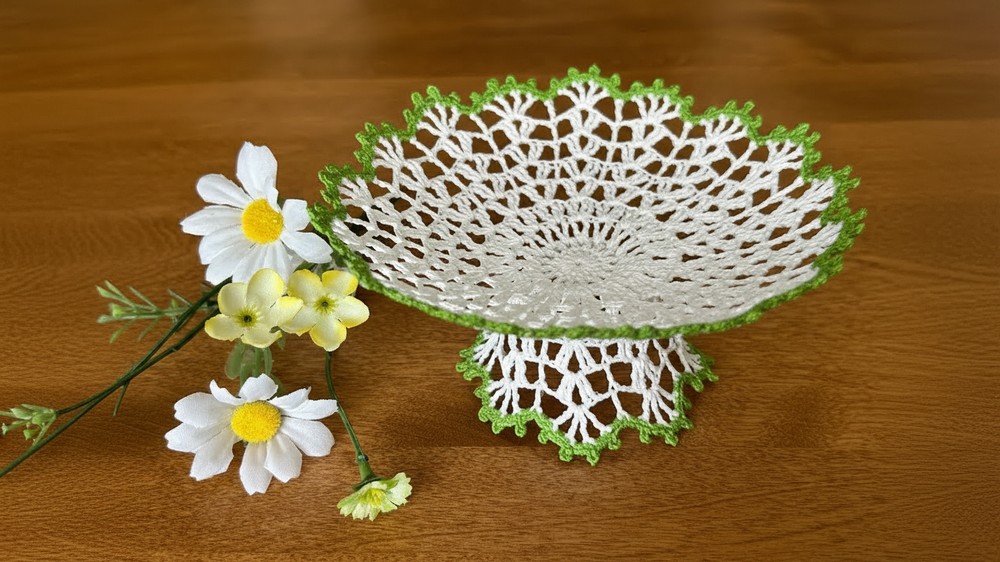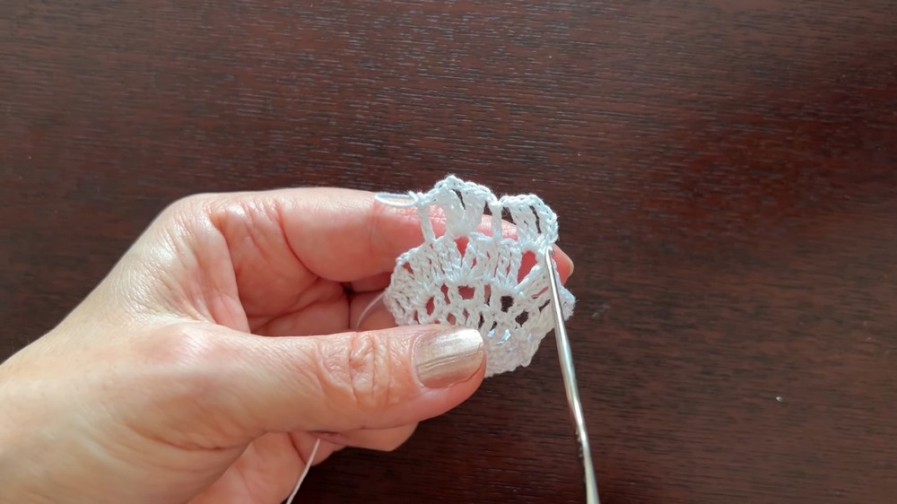 Shell stitches and decorative chains enrich the pattern, adding both texture and whimsical flair. Incorporating pique stitches along the edges toward the end, you give the vase a polished and refined look.