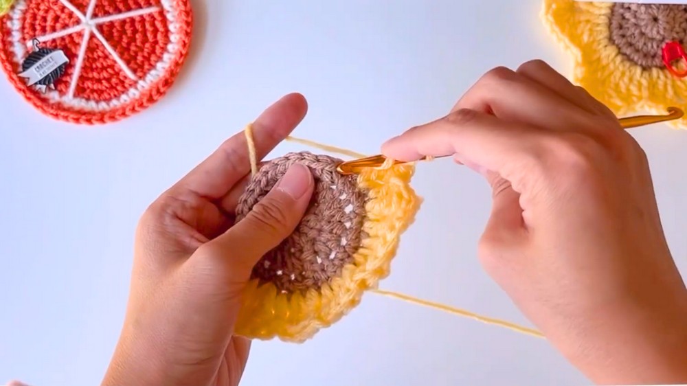 To make the coaster more durable, consider using cotton yarn as it absorbs moisture well and maintains shape even with regular use. Adding a small loop during the final step also allows you to hang the sunflower as a decorative piece.