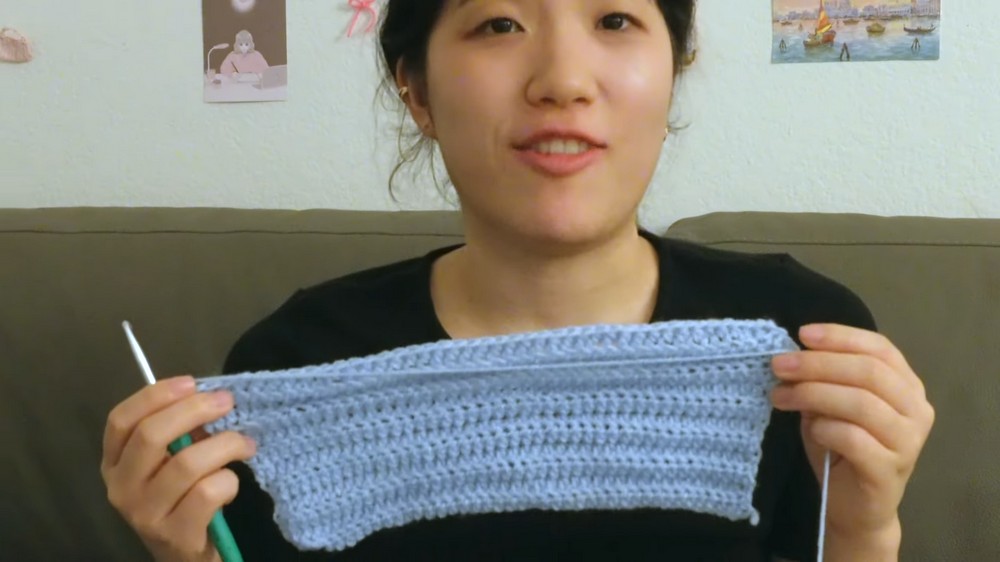 The process starts with a foundation chain of approximately 53 stitches to fit the body. A half-double crochet stitch in the third loop is used throughout, offering a smooth and stretchy texture that shapes the sweater beautifully.