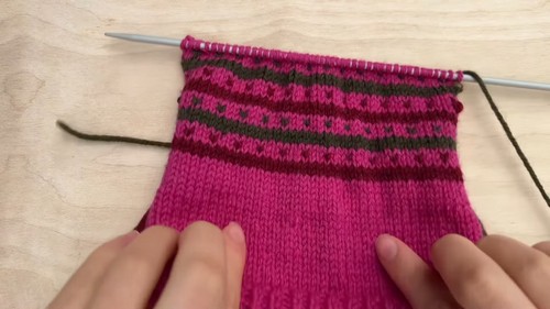- Start a new color on a purl row, weaving in the new yarn color. Work 2 rows with this new color.