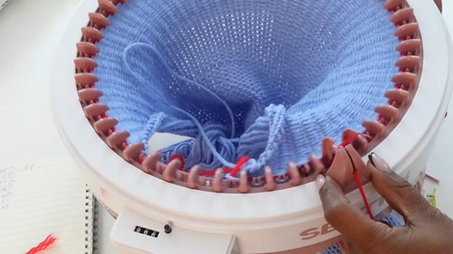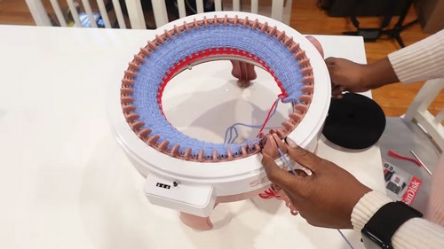 - Begin by casting on with your project yarn and your scrap yarn onto the circular knitting machine.