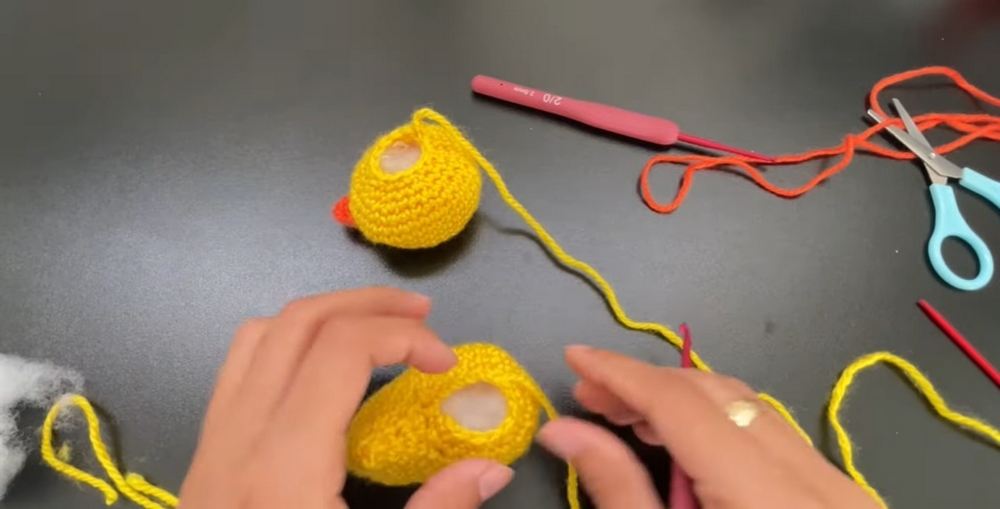 - The duck is made using two yarn colors: orange and yellow.