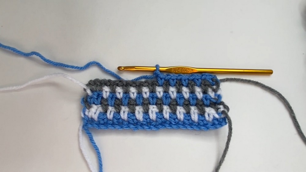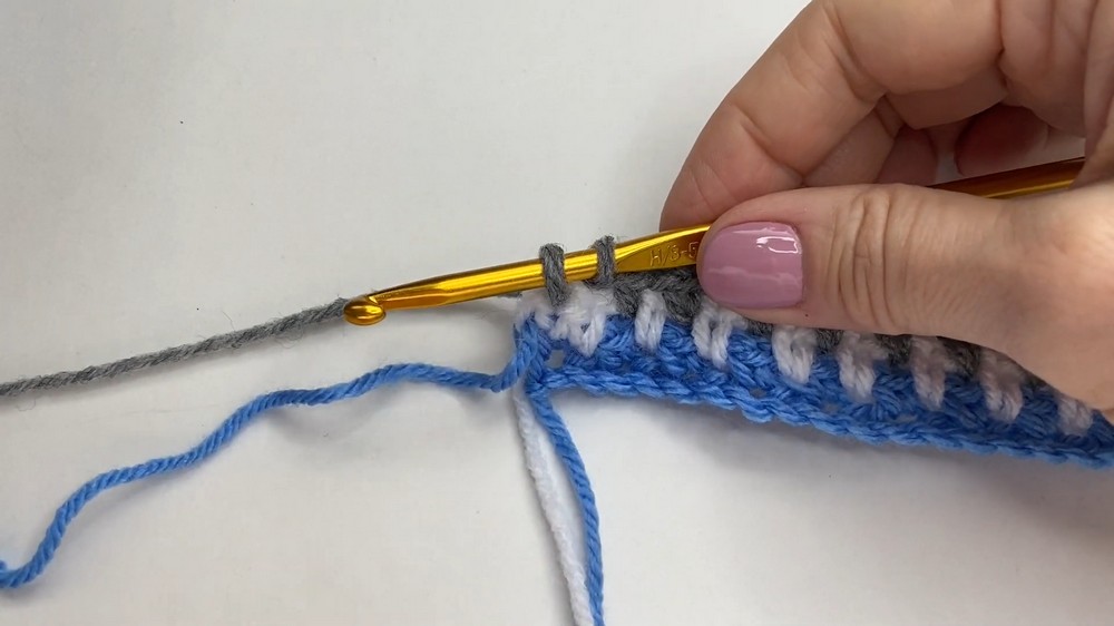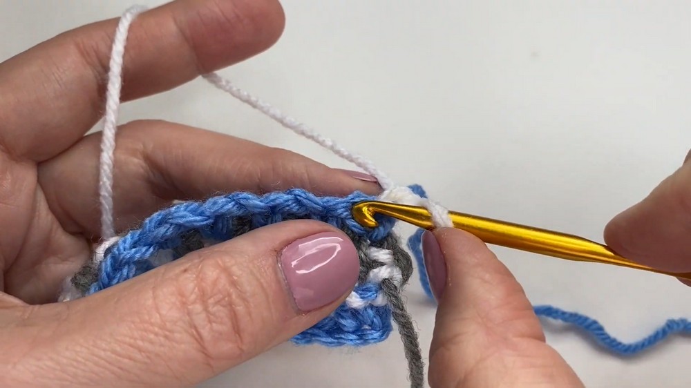 - Stop halfway through the last single crochet, and switch to the third color (e.g., gray).
