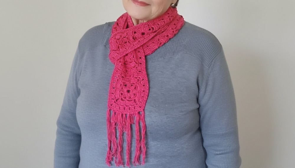 This tutorial is for a beautiful, shocking pink lace scarf featuring granny lace squares. Created in support of Breast Cancer Awareness Month, this scarf combines thoughtful design with purpose—a heartfelt gift symbolizing love and support for those battling or recovering from breast cancer. The squares resemble individual flowers and are joined together for a stunning final piece. Using lightweight mercerized cotton makes the scarf perfect for summer wear but can be adapted for winter using thicker yarn.