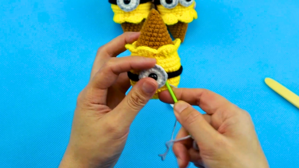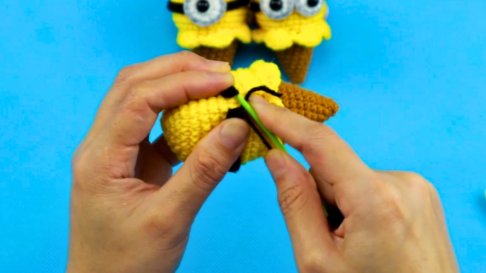 • Stitch the strap onto the Minion’s head, positioning it below the eyes.