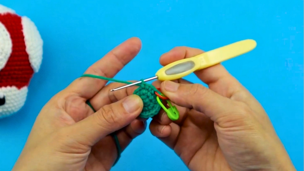 • Use a green yarn loop to sew the mushroom column to the mushroom head.