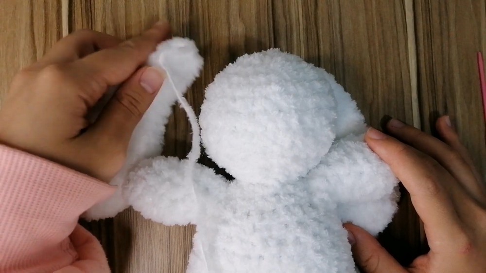 When sewing the parts together, position each piece (head, arms, and ears) before attaching, ensuring symmetry and balance for a polished look.
