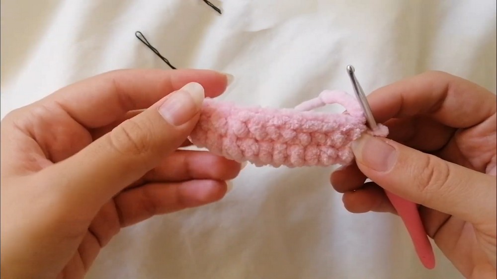 - Change to the pink yarn by working the last stitch loop in pink, then crochet pink single stitches along the same chain. Cut the extra yarn for a neat finish.
