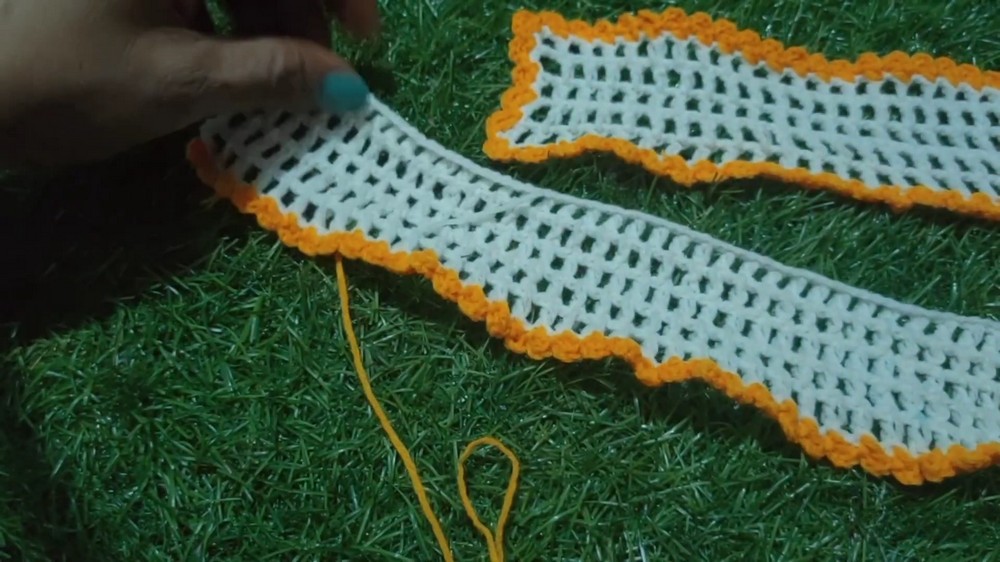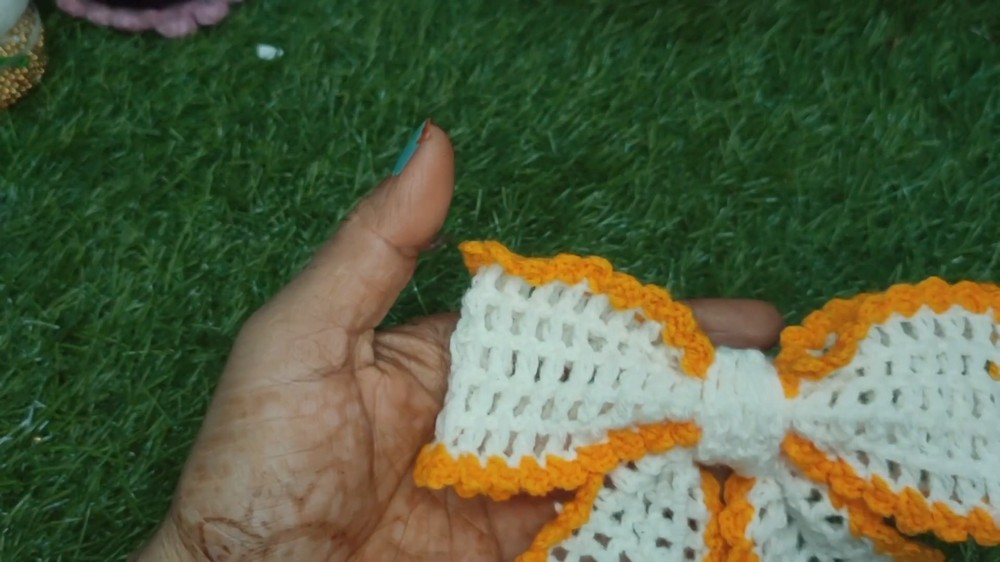 Once the rectangular piece is complete, cinch the middle tightly with yarn to form the distinctive bow shape, then tie off and weave in the ends to secure it neatly.
