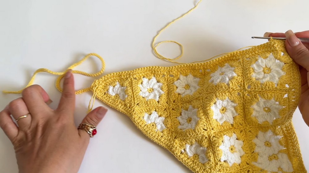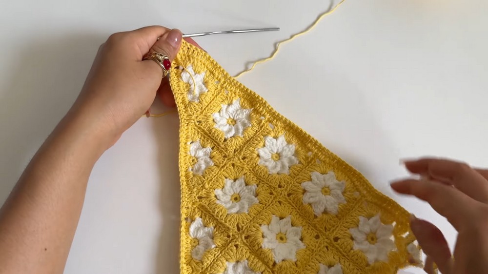 Once the squares and triangles are secured, a border of double crochet stitches is worked around the piece to enhance its overall shape.