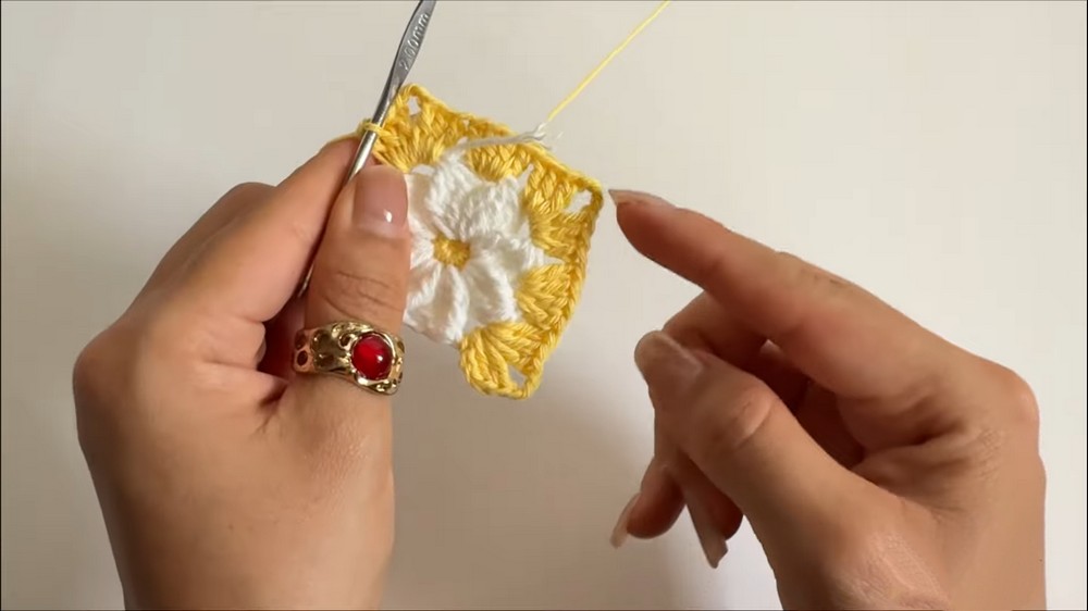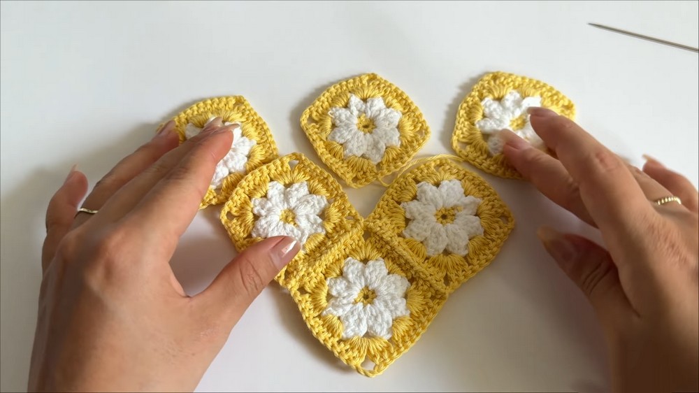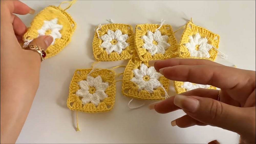 The pattern begins with crocheting small squares featuring eight petals, shaped using a combination of single crochet rounds and clustered double crochets.