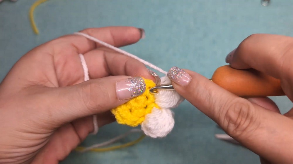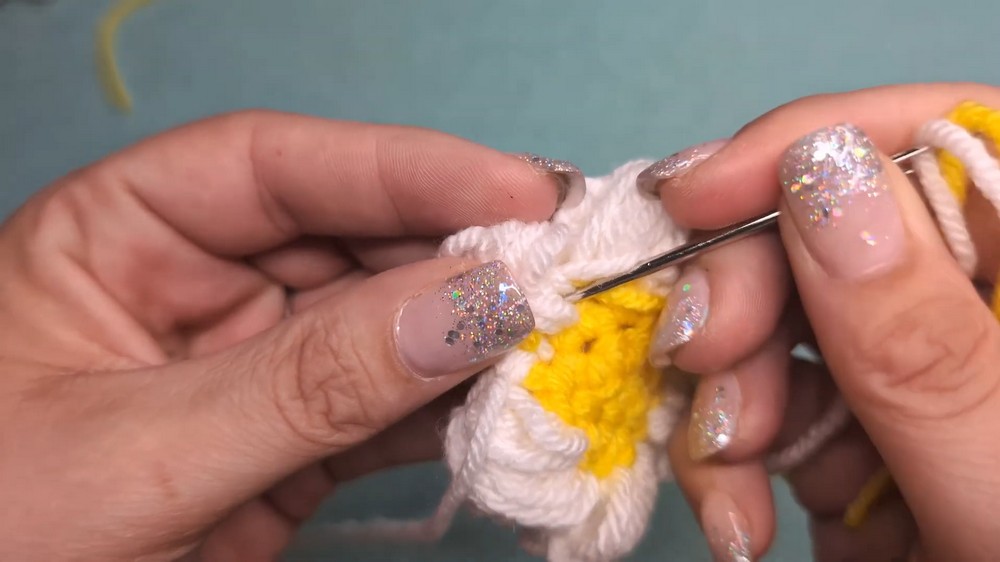 Carry Yarn Over as You Stitch: To save time sewing loose ends, carry extra yarn (like the tail of the yellow center) along the inside as you crochet the petals. This keeps the back clean and secure, making the finishing easier and tidier.